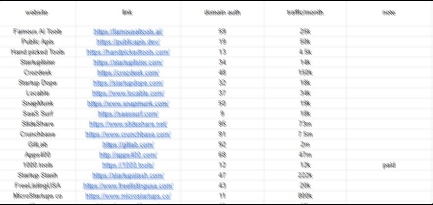 You will get more than 250+ SaaS Directories to list your startup include (platform name, link to submit, monthly traffic, domain authority, some notes about listing)